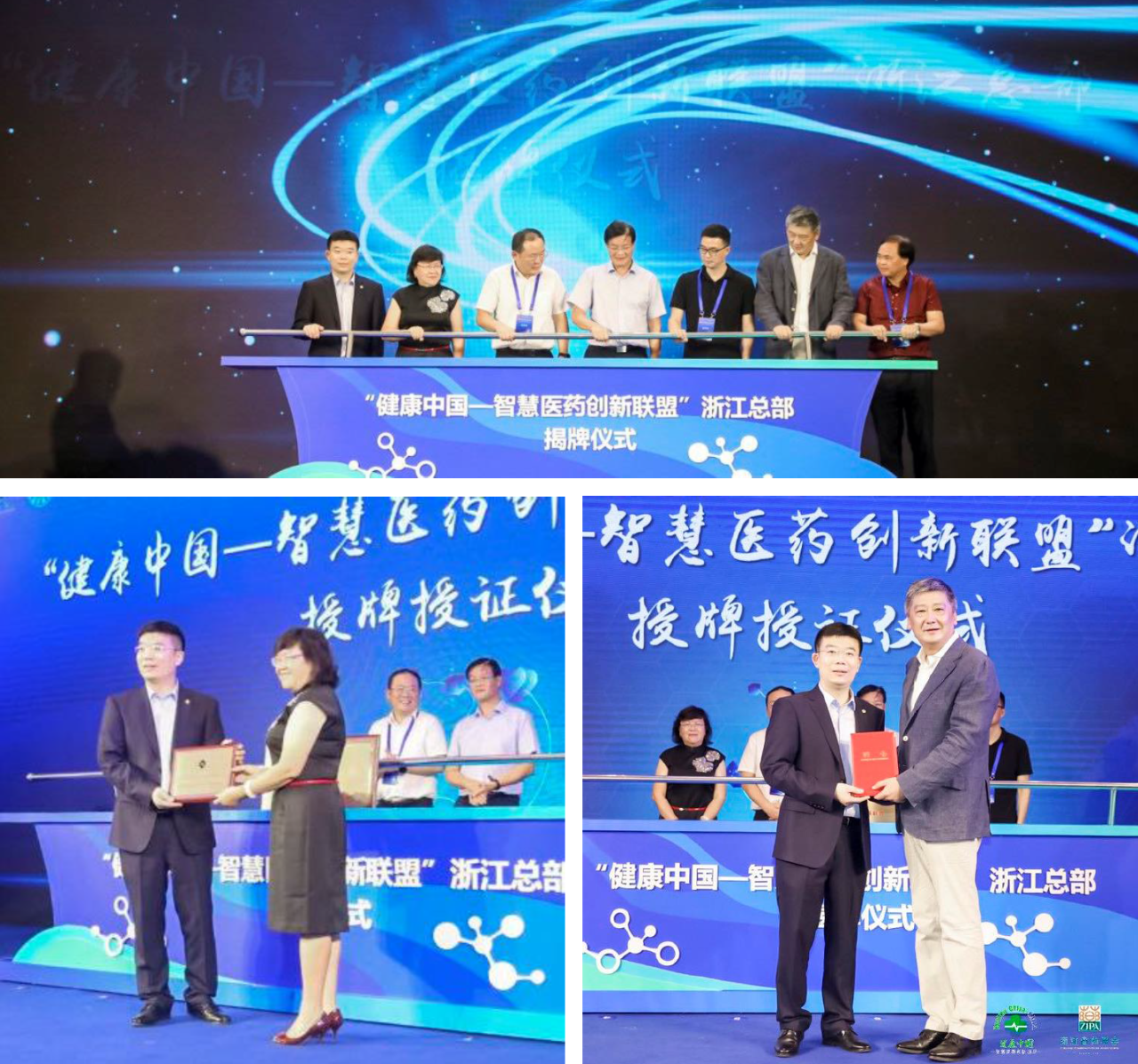 随后,浙江省药学会朱志泉理事长、浙江省药品监督管理局陈魁副局长、浙江省卫健委医政处孙卫东副处长、浙江省医疗器械行业协会张汉文秘书长、上海市药学会张晓敏副理事长、上海市药学会蔡仲曦副理事长、浙江英特集团股份有限公司应徐颉副总经理共同为“健康中国—智慧医药创新联盟”浙江总部成立揭牌,上海市药学会张晓敏副理事长与蔡仲曦副理事长分别授副理事长单位铜牌、副理事长聘书予浙江英特集团股份有限公司副总经理应徐颉先生。随着创盟浙江总部的成立,标志着创盟正式进入浙江省、面向长三角。